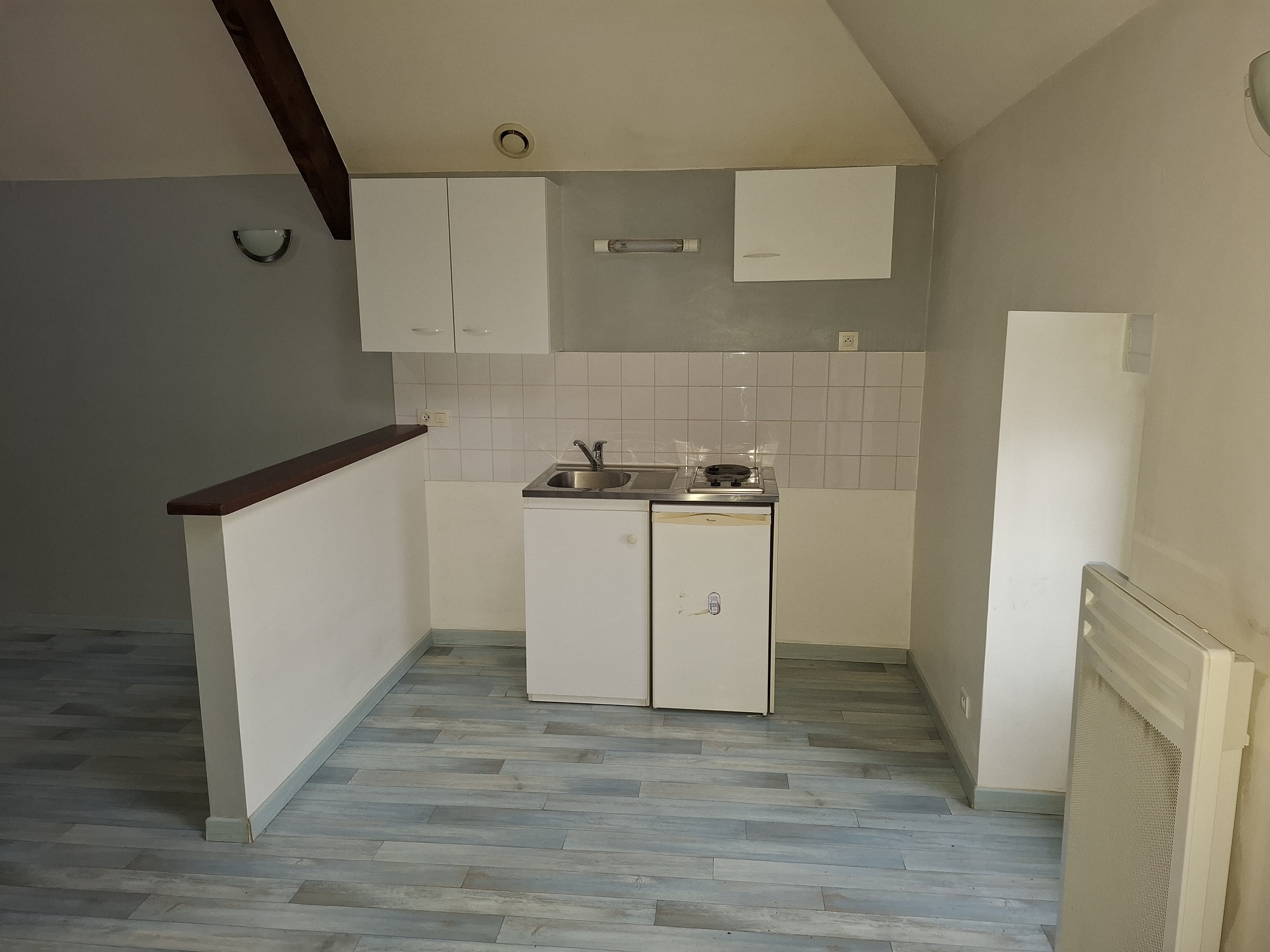 – Pièce de vie avec kitchenette (meubles de rangements, 2 plaques de cuisson et un petit réfrigérateur)